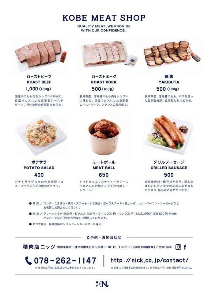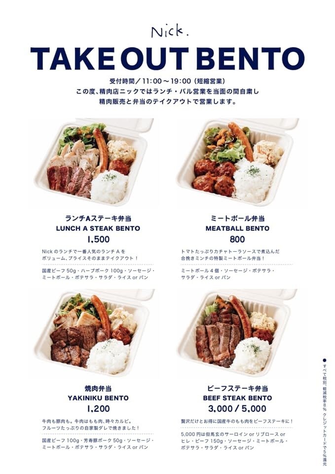 | テイクアウト営業時間 | 11:00-19:00営業時間については政府・自治体などの要請などにより、変更する場合もありますのでご了承ください。 |